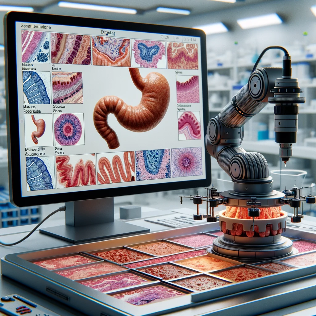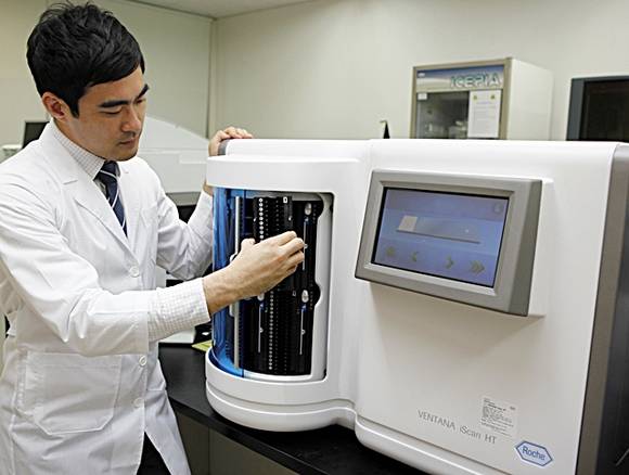 디지털병리는 이러한 슬라이드를 광학현미경으로 직접 관찰하는 것이 아니라 고배율 이미지를 촬영하여 컴퓨터에서 관찰할 수 있도록 한다. 디지털병리 이미지 촬영을 위해서는 특수 장비가 필요한데, 위 사진은 국내 2014년 도입된 Roche사의 디지털병리 기기이며 최근에는 큐리오시스 등 국내기업에서 국산화 시도도 하고 있는 중이다.