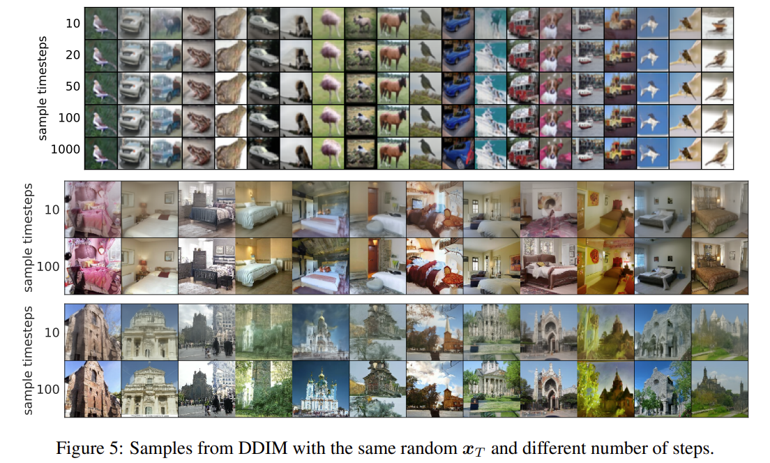 또한, 같은 latent x_T에서 샘플링된 이미지는, trajectory에 상관없이 동일한 high level feature를 갖는 consistency를 보였다.