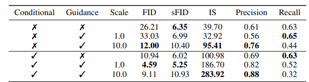 Classifier Guidance는 Recall을 희생하여 Precision을 높인다. 생성모델에서 Prec와 Rec은 실제 이미지 manifold를 ground truth로 하고, generated image manifold를 predicted로 하여 계산되는데, precision이 높아졌으므로 generated image 중 실제 manifold에 속하는 이미지가 늘어난 것이다.