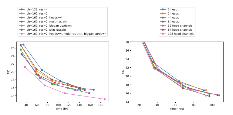 - Attention head가 쓰이는 위치를 늘리자. (기존에는 16x16에서만 쓰였으나 32x32, 16x16, 8x8 모두에 쓰기로)
