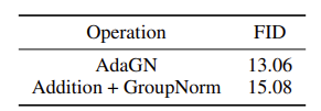 AdaGN은 Ho et al.에서 사용한 Addition + GroupNorm보다 FID의 개선을 보였다.