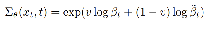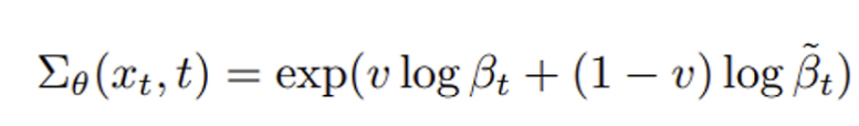 DDPM 논문의 저자 Ho et al. 도 학습 안전성과 효율성을 위해 sigma를 고정한 채로 사용하였다. 분산을 크게 고정하면 diversity가 올라가고, 작게 고정하면 fidelity가 올라간다. 또한, Nichol&Dhariwal의 IDDPM에서는 분산을 고정시키는 게 아니라 최대분산과 최소분산 사이에서 학습되도록 했다. 즉 아래 식에서 interpolation 정도를 조절해주는 v를 결정하는 것이다.