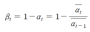아래 식이 성립하므로, 코드와 같이 alpha_bar라는 람다함수에서 beta를 계산해서 betas 리스트에 추가할 수 있다.