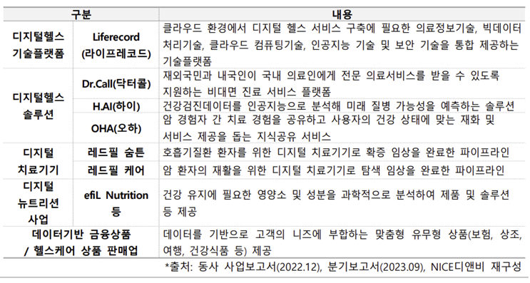 디지털 헬스 기술 플랫폼 및 디지털헬스 솔루션, 디지털 의료기기 등의 개발과 공급을 주요 사업으로 영위하고 있음.