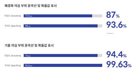 또 다른 주력 제품인 DEEP:CHEST 또한 굉장히 많은 회사에서 하고 있는 Chest PA 기반 병변 segmentation/classification 모델이다. 이때 폐경화 기흉에서는 높은 성능을 보였는데, 섬유화, pleural effusion 등에서는 성능이 상대적으로 낮았다.