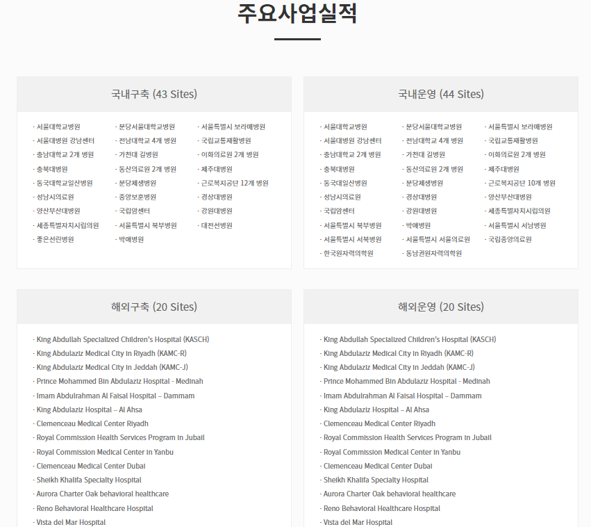 동사의 주요 제품으로는 구축형 의료정보시스템 및 클라우드 의료정보시스템이 있으며, 국내 주요 대학병원 및 종합병원을 중심으로 다수 도입되었음.
