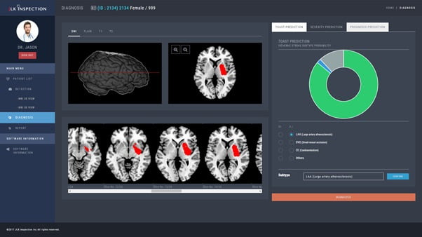 JBS-01K는 뇌경색을 TOAST criteria (Trial of ORG 10172 in Acute Stroke Treatment)에 기반하여 5개의 아형으로 나누어 분할한다. 이때 심실세동(AFib) 여부도 함께 학습하여, 진단을 보조할 수 있다고 한다.