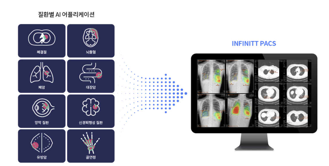 인피니트헬스케어는 PACS의 압도적인 국내 점유율 1위이다. 2024년 초 기준 상급종합병원급 75%, 종합병원급 70%의 점유율을 가지고 있으며, 주요 매출처는 소프트웨어를 탑재한 서버와 PC의 직접 공급이다. 점유율이 높다 보니, 자체 개발한 AI 소프트웨어를 PACS에 곧바로 올려 판매하는 플레이를 할 수 있다. 기존에 사용하던 PACS와 쉽게 연동 가능한 플랫폼 형태로 개발하다 보니, 장비나 소프트웨어를 별도로 구매하지 않아도 된다는 점이 강점이다.
