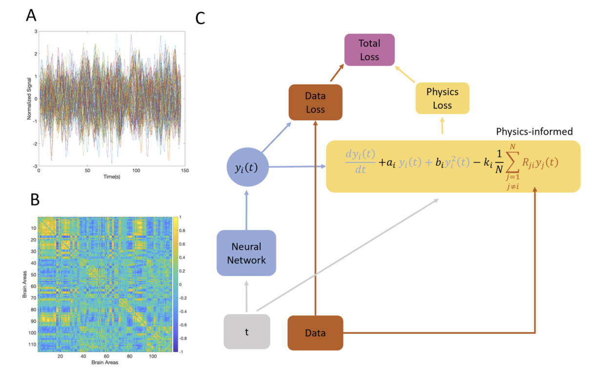 본 논문에서는 ABIDE 데이터셋 (ASD 자폐스펙트럼증후군 vs 정상 fmri를 구분하기 위해 1112명의 뇌영상 데이터를 모아놓은 오픈 데이터셋)으로 실험하였으며, 아래와 같은 프레임워크를 구축하였다. 노란색 박스에 있는 수식이 PINN을 위한 미분방정식이다.