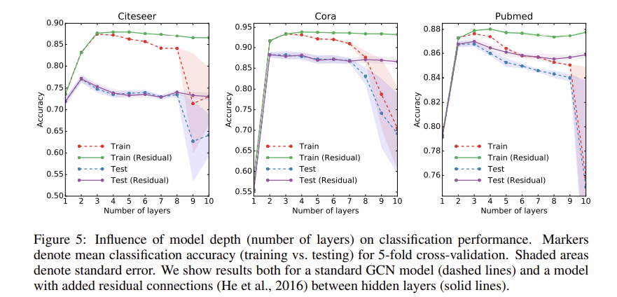 GCN은 일반적으로 몇 개 수준의 layer를 적용하는 것이 좋냐에 대해, 2016년 Kipf 논문에서 진행한 실험에 따르면 대충 3개 정도가 적당해 보인다. (물론 데이터의 복잡도에 따라 달라지겠지만)