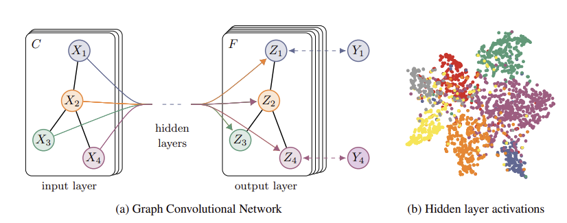 이렇게 정규화한 $ \hat{\mathbf{A}} $ 를 feature 및 파라미터 (W) 와 연산하여 활성화 함수에 통과시키는 것이 하나의 layer이다. 즉 하나의 layer의 계산과정은 $\mathbf{H}^{(l+1)} = \sigma\left( \hat{\mathbf{A}} \mathbf{H}^{(l)} \mathbf{W}^{(l)} \right)