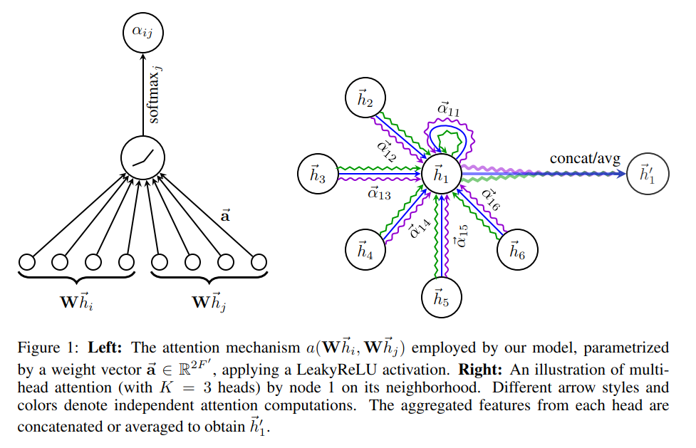 $$ e_{ij} = \text{LeakyReLU}\left(\mathbf{a}^\top \cdot [\mathbf{W}\mathbf{h}_i \, \| \, \mathbf{W}\mathbf{h}_j]\right) $$