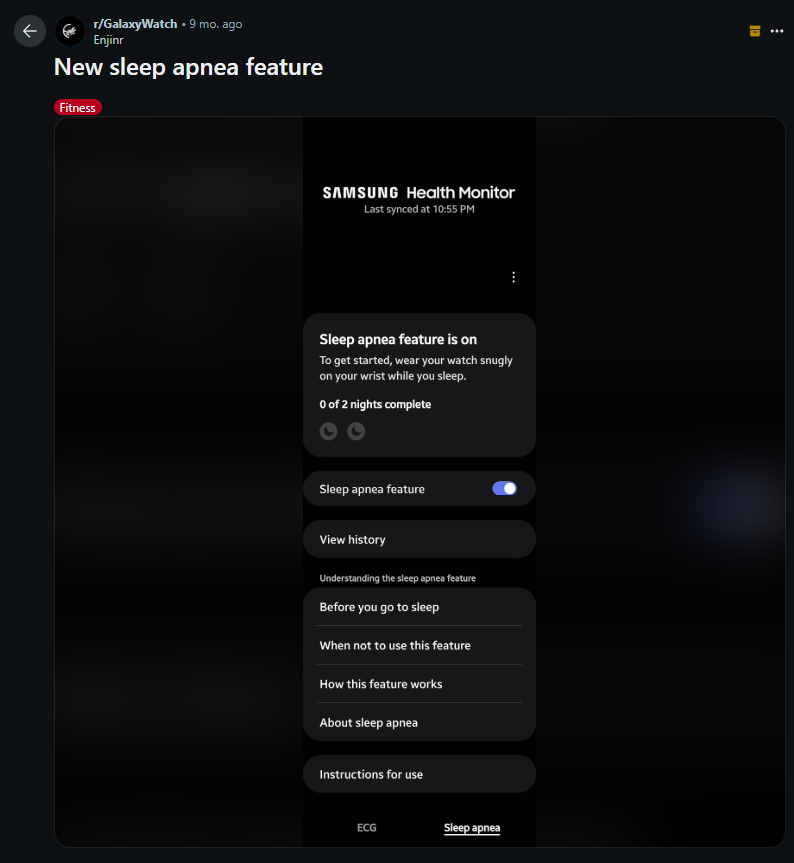 삼성전자는 다름 아닌 Galaxy Watch에 탑재되는 수면무호흡증 감지 기능으로 de novo를 받았는데, 이는 워치와 연동되는 스마트폰 어플로 OSA(Obstructive Sleep Apnea)를 감지하여 위험도를 판단한다. 이는 FDA에서 최초로 승인한 수면무호흡 감지용 웨어러블 기술로 평가된다.