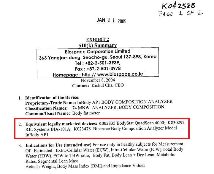 인바디는 자신의 예전 모델을 predicate으로 하여 FDA 510(k)를 받았다. 이전 모델의 510(k)를 살펴보아도 이러한 전략을 여러 번 취했음을 알 수 있었다. 그러면 최초의 predicate은 무엇일까...를 살펴보다가 2005년 자료에서 찾을 수 있었다.
