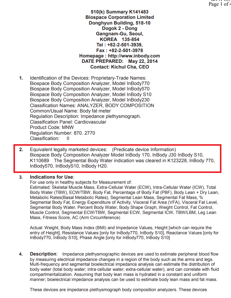 인바디의 InBody 770, 570, 230, S10 제품군은 2014년 510(k)를 신고하였다. 해당 서류를 살펴보자.