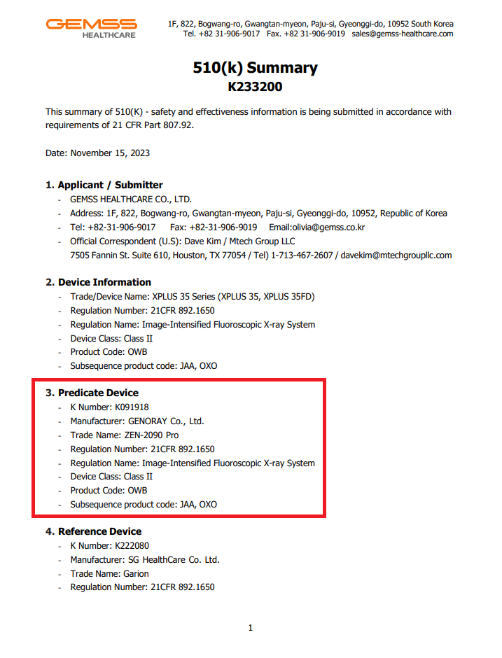Predicate Device로 GENORAY사에서 생산한 ZEN-2090 Pro를 삼은 것으로 확인이 된다. (Pro랑 turbo랑 같은 제품군인지는 확인해 봐야한다) 이는 GEMSS 사의 제품과 "실질적으로 동일"(SE) 하다는 것으로 해석되었다는 의미다.