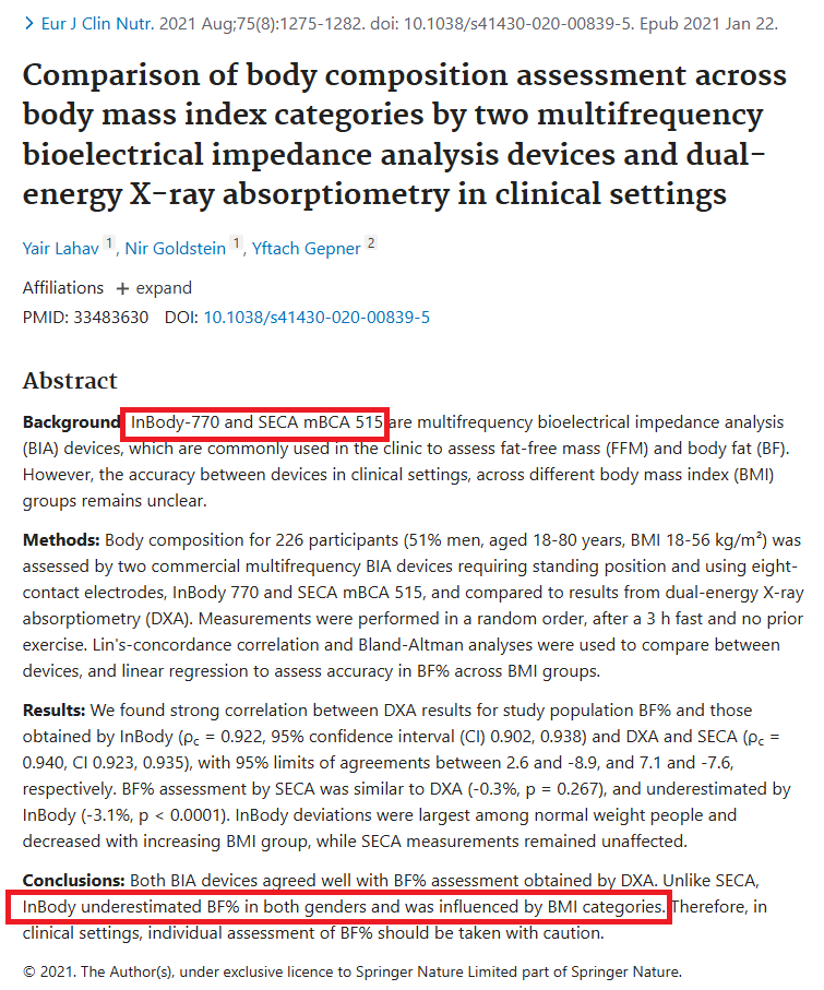 최근에는 인바디와 경쟁사들의 임상효과를 비교하는 논문들도 많이 등장하고 있는데, 타사 제품에 비해 체지방률을 낮게 예측한다는 이야기도 있는 것 같다.