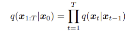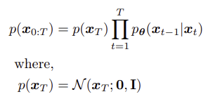 마지막으로, 세 번째 조건에 따라, joint distribution은 아래와 같이 쓸 수 있으며, $p(x_T)$는 gaussian이다.