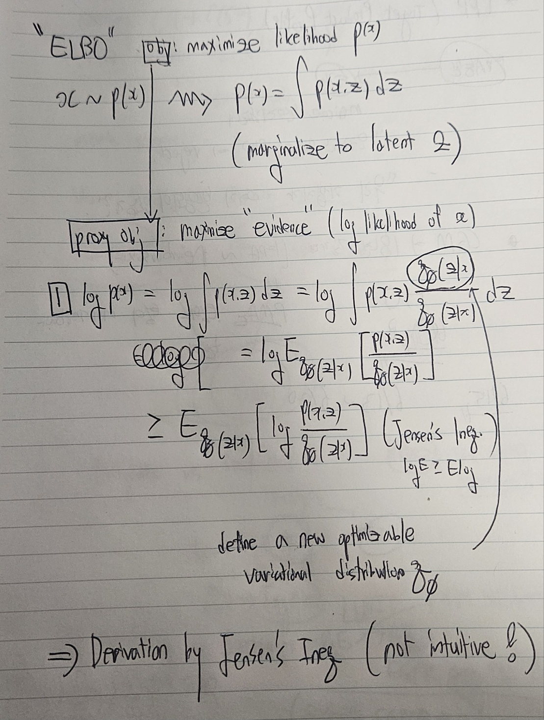 Introduction에서도 설명했듯이 GM의 objective는 x의 분포 p(x)의 likelihood를 최대화하는 것이다. 그러나 이는 대부분의 경우 intractable하다. 따라서, "evidence"라 불리는 log likelihood $logp(x)$의 하한선을 maximize하는 것을 proxy objective로 한다. 이를 위해, evidence의 하한선을 최대화하는 전략을 쓰고, 그 하한선을 ELBO라고 한다.
