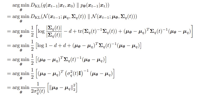 특히, 두 gaussian 간의 KL divergence 공식을 이용하여 정리해 보면, $q(x_{t-1} | x_t, x_0)$와 $p_\theta (x_{t-1} | x_t)$는두 분포의 평균의 square error에 상수가 곱해진 형태로 정리할 수 있다.