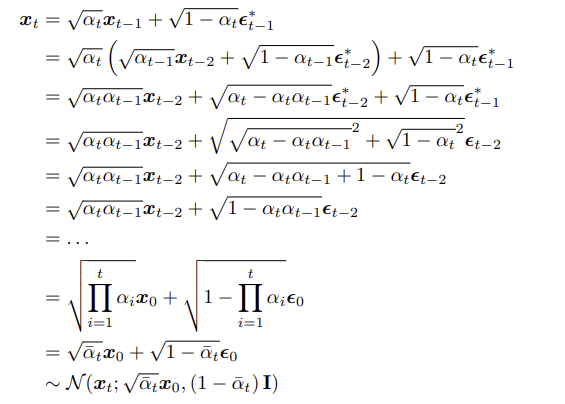 이 식을 bayes rule로 정리했던 부분에 대입하면(계산 생략) $q(x_{t-1} | x_t, x_0)$를 아래와 같이 계산 가능한 분포로 나타낼 수 있다.