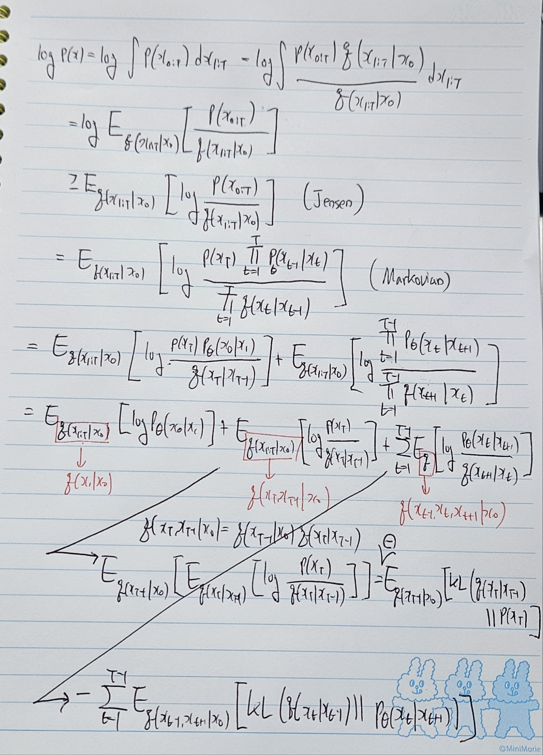 HVAE에 Markov assumption (각 latent는 직전 latent에만 영향받는다)를 추가하면 MHVAE(Markovian HVAE)가 되는데, Markov chain 특징에 따라 ELBO를 아래와 같이 한 번 더 전개할 수도 있다.