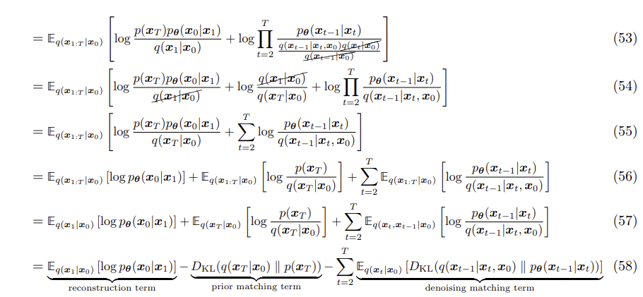 Jensen Inequality로 ELBO를 만들고, Markovian 특징을 이용해 저개하는 것까지는 똑같으나, 분자에서의 $p_\theta (x_0 | x_1) $ (이 부분은 VAE에서의 reconstruction loss와 유사한 term이 될 부분), 분모에서의 $q(x_T|x_{T-1})$ (이 부분은 VAE의 prior matching과 유사한 term이 될 부분) 을 따로 빼어 정리한다.