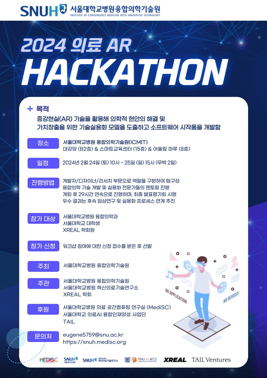 어제부터 무박 2일로 진행되었던 의료 AR 해커톤(2024.02.24~2024.02.25.)에 다녀왔다. 해커톤이라는 형태의 대회에 참가해 본 건 이번이 처음이었다. 우리 경제경영 학회를 같이 하는 친구들이 개인 자격으로 여러 명 참가했고, XREAL이라는 서울대 XR/메타버스 학회에서도 여러 명이 와서 메디컬 분야와 AR 분야의 콜라보 느낌으로 진행되었다.
