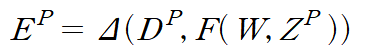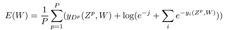 Z^p는 p번째 input pattern을 의미하며, W는 갱신 가능한 파라미터(가중치), Y^p는 Z^p라는 패턴에 대한 인식 라벨이라고 할 수 있다. 이때 p번째 연산에 대한 loss function E은 아래와 같이 정의된다.