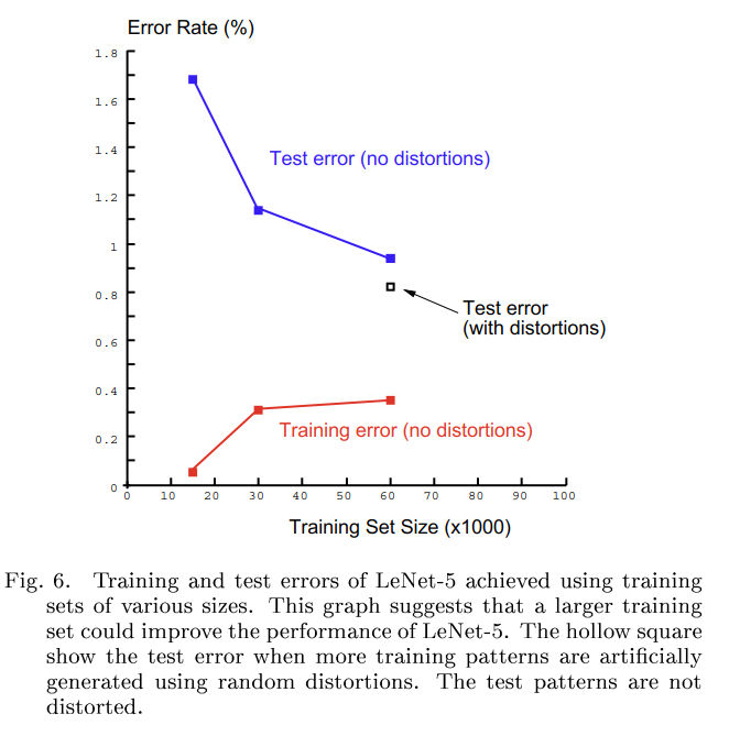 또한 training set의 크기가 증가할수록 error는 위와 같이 변하였다. (test error는 줄어들었지만 training error는 증가) Training set의 크기가 증가할수록 test error가 줄어든다는 가설을 검증하기 위해, 일부 데이터를 아래와 같이 distortion하여 학습을 시켰더니 test error가 줄어들었다.