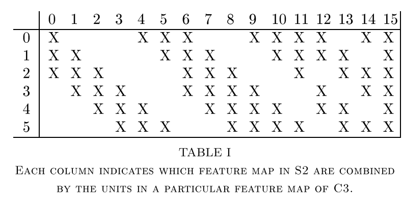 아래 그림을 보면, layer C3의 0~5번 map은 S2에서 연속한 3개의 map 정보를 가져온다. 6~11번 map은 연속한 4개의 map 정보를 가져오며, 12~14번 map은 두개/두개로 나뉜 4개의 map 정보를, 15번 map은 모든 map에서 정보를 받아온다. 이를 종합하면, 이 layer에는 총 1,516개의 파라미터와 151,600개의 연결이 생긴다. (각 파라미터는 shared weights 규칙에 의해 100번씩 쓰인다)