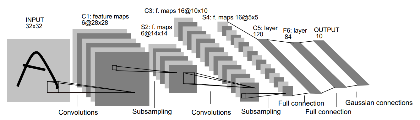 본 논문에서 소개된 LeNet-5의 아키텍처를 살펴보면서 위 세 가지 구조가 어떻게 들어가 있는지 살펴 보자.