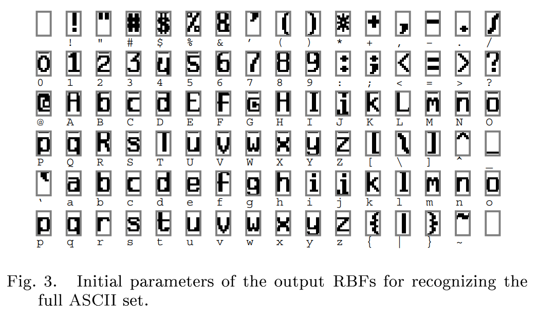 - Output layer: F6에서 84개의 input을 받아, Euclidean Radial Basis Function unit (RBF)를 적용하여 출력한다. 이는 input으로 들어오는 vector와 parameter 사이의 거리를 측정하는 함수다. Loss function은, 정답에 해당하는 RBF의 parameter vector와 가능한 한 가까운 input이 들어왔을 때 작아지는 함수로 설정해야 한다. 이 층에서의 parameter는 학습되는 것이 아니며, 수동으로 조정된다. 파라미터는 총 10개이고 +1 혹은 -1의 값을 갖는데, 총 2^10 개의 output을 표시 가능하여 ASCII code를 모두 커버할 수 있다.