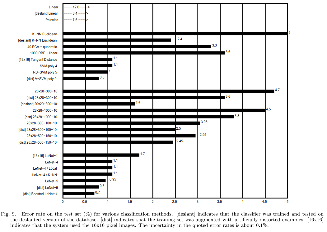 다른 모델들과 비교했을 때 LeNet-5의 성능은 상당히 훌륭하였다. 비교에 사용된 모델들은 다음과 같다.