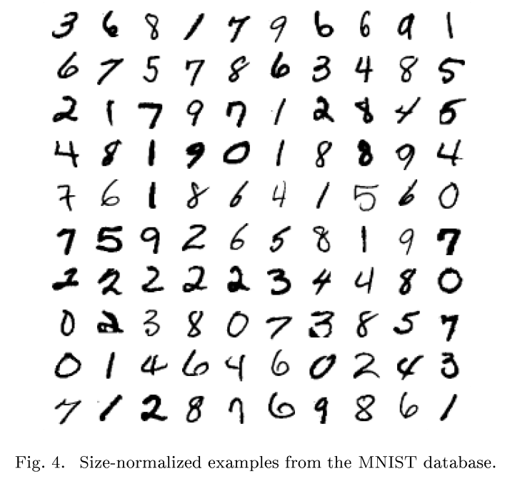실제 실험에서는 training에서는 60,000개의 데이터를 모두 썼고, test는 모아놓은 데이터의 부분집합인 10,000개만 사용하였다. 이 새로운 데이터베이스를 MNIST라고 하였다.