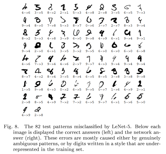 아래는 LeNet-5가 잘못 분류한 82개의 test pattern들이다. (이건 원래 못 쓴 거 아닌가....)