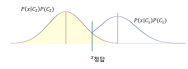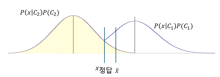 이런 경우, x_정답과 x_hat 사이에 있는 x값에 대해서는, 실제 답은 "스팸 메일"이지만 분류기준이 x_hat이므로 "스팸 메일이 아님"으로 분류된다. 이 misclassification 될 확률을 최소화하는 것이 목표이다.