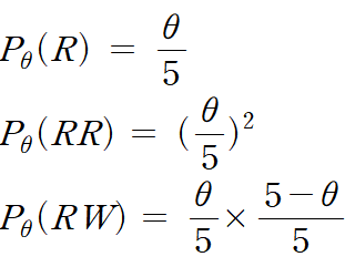 이때, 두 번 뽑았을 때 RR이 나올 때 theta에 대한 가능도 함수는 아래와 같이 정의된다.