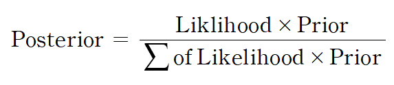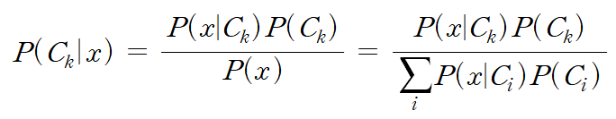 이 P(Ck | x)를 사후확률(Posterior)이라고 한다. 베이즈 정리 우변에 있는 식에 들어가는 항들은 위의 분포에서 직접 계산 가능하다. 위 그래프에서 x_정답이라고 표시된 곳보다 큰 x에서는 스팸 메일일 확률이 스팸 메일이 아닐 확률보다 크고 작은 x에서는 반대의 경우이므로 x_정답이 분류 기준이 될 것이다. 정리하면, 사전확률은 아무런 정보(x)가 없을 때 어떤 메일이 스팸인지 아닌지의 단순 확률을 말하며, 사후확률은 어떤 메일의 x점수가 주어졌을 때 그 메일이 스팸인지 아닌지의 확률을 의미한다. 이를 아래와 같이 적을 수도 있겠다.