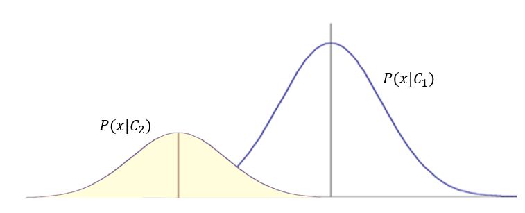 스팸이 아닌 메일일 사전확률 (P(C2)) 이 더 높을 것이므로, 노란색 분포가 더 높이 올라갔다. 이제, 특정 x 점수를 갖는 메일이 왔을 때 스팸으로 분류해야 하는지 스팸이 아닌 것으로 분류해야 하는지 생각해보자. 이는 P(C1 | x) 혹은 P(C2 | x)를 계산하면 될 것인데, 여기서 베이즈 정리가 들어간다.
