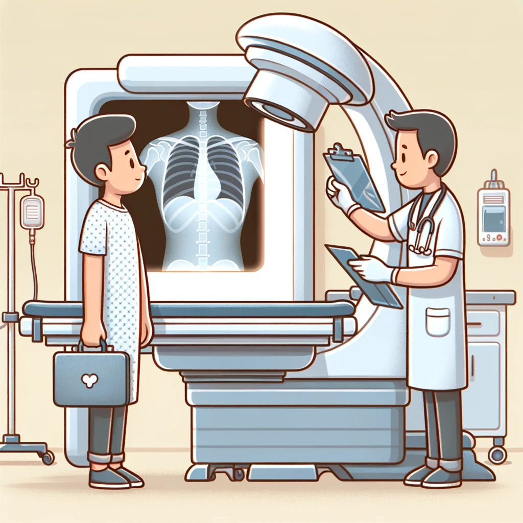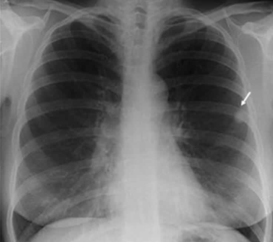 CXR상에 나타난 정보를 점수화하여 TB granuloma가 존재하는 환자의 분포를 추정하는 기계를 만든다고 하자. 아래 그림에서는 사진 우측에 보이는 화살표가 granuloma에 해당하는 영역이다.