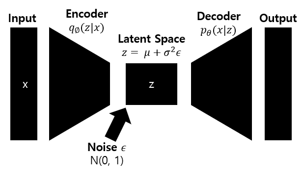 AE(Autoencoder)와 VAE(Variational Autoencoder)는 바로 이 latent space에서 noise의 주입 여부에 따라 바뀐다. AE는 input으로 들어온 x가 encoder, latent space, decoder를 거쳐 output으로 나갈 때 x와 최대한 비슷해지는 것이 목적이다. 반면, VAE는 latent space에 noise를 추가하여, decoder를 거쳤을 때 입력 데이터에 없었던, 새로운 출력을 만드는 것이 목표이다. 이것이 VAE가 생성형 AI (Generative AI)인 이유이다.
