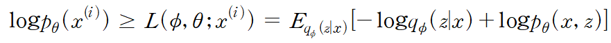 KL divergence의 non-negativity를 적용하면 아래와 같다. 여기서 log p_theta (x, z)는 결합 로그 확률 분포로, 기댓값을 x와 z를 모두 고려하여 나타내는 것이다.