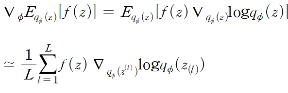이제, optimization을 통해 ELBO를 parameter로 미분해야 한다. 여기서 phi로 직접 미분하는 것은 어렵다. 일반적으로 이런 문제에서는 ***naive Monte Carlo gradient estimator라는 방법을 사용해 아래와 같이 "근사적으로" 미분을 수행할 수 있다.