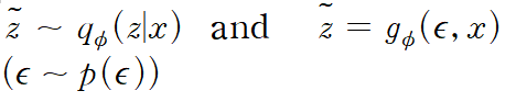 이제, "실용적인" ELBO와 그 미분값을 찾기 위하여 새로운 방법을 적용해 보자. 여기서 사용되는 것이 reparametrization trick이다. 기존 방법에서는 아래의 근사 분포를 직접 이용했었다.