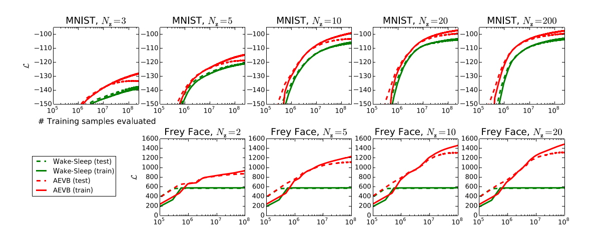 기존의 모델인 wake-sleep 알고리즘과 비교한 결과, 모든 경우에서 VAE가 우월한 결과를 보였다. 또한, latent variable의 개수가 많다고 해서 overfitting이 나타나지 않았다.