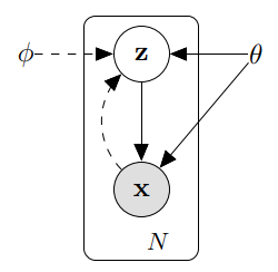 위 그림에서 점선은 encoder를, 실선은 decoder를 나타낸다. 즉, 점선은 q_phi (z|x)에 따라 "계산하기 어려운 posterior "에 해당하는 p_theta (z|x)를 만드는 과정이고, 실선은 p_theta(z)p_theta(x|z)를 이용하여 x를 generation하는 과정을 나타낸다. 여기서 parameter인 phi와 theta는 공동으로 학습된다.