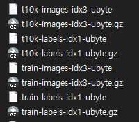 MNIST 데이터셋은 위와 같이 4가지로 구성된다. train으로 시작하는 것은 트레이닝 세트이다. t10k로 시작하는 것이 테스트 세트이며, "test 10,000"의 약자이다. 1만 개마다 데이터 포인트가 들어있다. ubyte는 "unsigned byte"의 줄임말이다. Grayscale image의 각 픽셀의 intensity는 0~255의 값을 나타내므로 음수 영역은 필요가 없어 unsigned byte를 사용한다. (C언어에서 unsigned int와 같다)