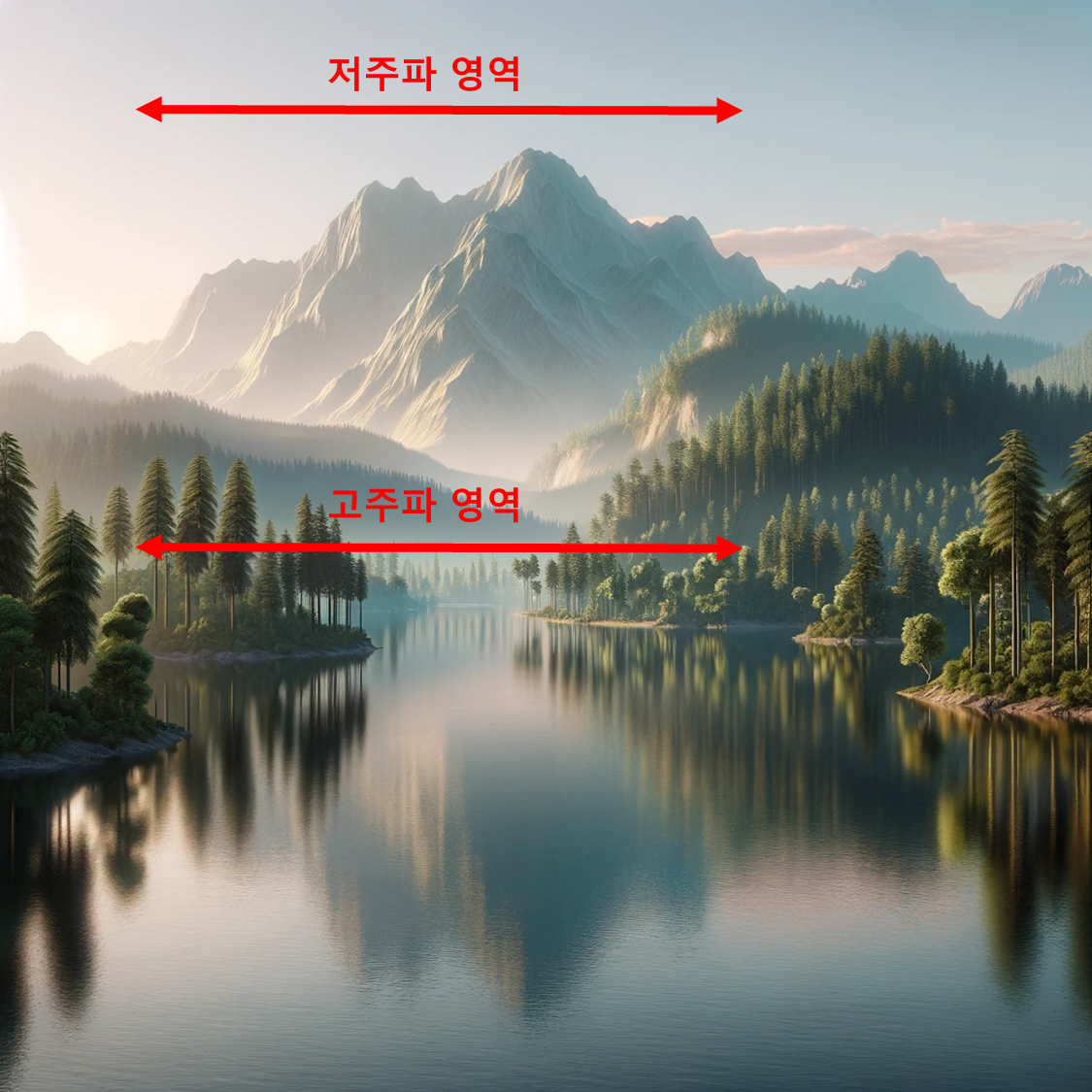 주파수 영역이 직관적으로 어떤 의미를 가질까? 이미지에서 가로 혹은 세로 방향으로 이동했을 때, intensity 차이가 적게 나는 픽셀들 (ex: 하늘) 은 저주파로 이루어진 공간주파수들이 분포한다. 또한, 디테일한 부분이 많이 그려져 있어 높은 선명도를 요구하는 부분 (ex: 숲) 은 고주파로 이루어진 공간주파수들이 분포한다.