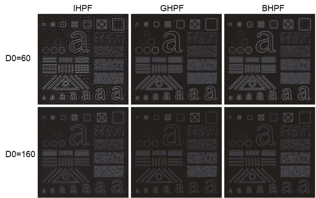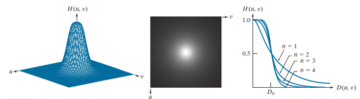 이는 n값에 상관없이 거리가 D0인 곳에서 함숫값을 50%로 낮추는 것이 된다. 또한, 거리가 D0보다 가까운 곳은 n이 커질수록 손실률이 줄어들지만, D0보다 큰 곳은 n이 커질수록 손실률이 커진다. 같은 D0값에 대해 세 가지 필터 중 중간 정도의 blurring이 생긴다. 또한 GLPF와 마찬가지로 ringing 현상이 생기지 않는다.